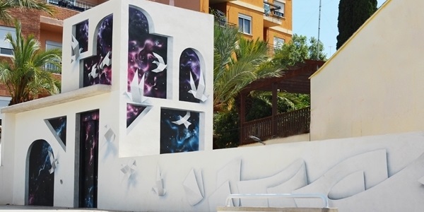 Ja podem admirar la nova peça que l'artista italià, veí del nostre poble, Giacomo Pennicchi ha pintant a la Plaça del País Valencià i que rep el nom de "Murigami" (Mur+Origami). En esta nova intervenció Giacomo ens proposa un joc de tridimensionalitat sobre la caixa de l'ascensor de la Sala d'Escposicons. Des del mur sobre la plaça veiem com unes làmines es van transformant per mitjà d'un joc de papiroflèxia (Origami) en uns pardals de paper que volem entre una arquitectura il·lusòria cap a un univers obert a l'interior de l'edifici. Una proposta elegant i evocadora que completa la intervenció de renovació de l'escenari de la Plaça del País Valencià i l'ampliació de la Sala d'Exposicions i que, des de ja, esdevé un element icònic per a este espai.