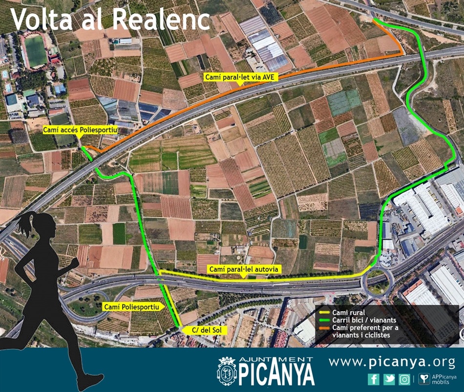 El nostre recorregut arrancarà al final del carrer del Sol, creuarem la Travessera de la Diputació i avançarem pel camí del Poliesportiu. No més passar per baix del pont de l'autovia accedirema a un camí que ix a mà dreta, un camí paral·lel a l'autovia i emmarcat per arbres que ens conduirà fins a l'autovia de la Creu (la de l'eixida cap a València). Ahí ja entrarem en un tram de carril bici que ens portarà pel camí de Faitanar a passar per dalt de les vies de l'AVE. Tan bon punt baixem este pont, a má esquerra, tornarem cap a Picanya i entrarem en un camí paral·lel a les vies de l'AVE que ens durà fins al camí d'entrada al Poliesportiu.