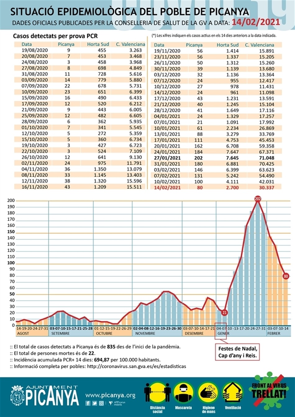 Segons les darreres dades publicades per la Conselleria de Salut de la Generalitat Valenciana, el nombre casos positius per PCR en els darrers 14 dies al nostre poble és de 80, el nombre de persones que han mort es manté en 22 i el de casos positius des de començà la pandèmia (març 2020) arriba ja a 835. La incidència acumulada (casos per 100.000 habitants) baixa a 694,87.