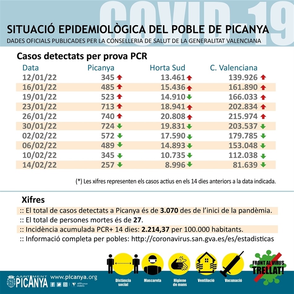 Segons les darreres dades publicades per la Conselleria de Salut de la Generalitat Valenciana (i corresponents al dia 14 de febrer), el nombre casos positius per PCR en els darrers 14 dies al nostre poble ha baixat a 257, després d'arribar al màxim històric de 740 amb les dades del 26/01/2022 i els 572 de fa dues setmanes.