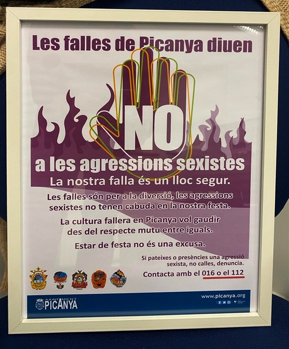 Les falles de Picanya han volgut fer públic el seu rebuig a qualsevol tipus d'agressions sexistes i en este sentit, el passat dia 7, en el decurs de la Gala de la Cultura, les quatre comissions del nostre poble van rebre, de mans de l'Ajuntament, un distintiu per a col·locar als casals on llegim: